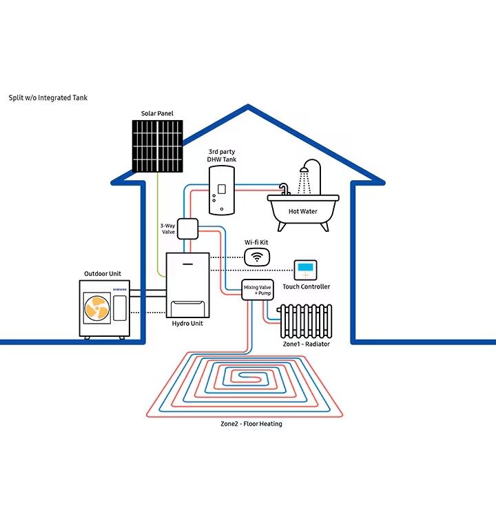 Samsung EHS Split’in hidrolik parçaları, bir dış ünite yerine iç bir hidro ünitesine dahildir. Hidro Ünitenin de kurulumu kolaydır ve az alan kaplar.